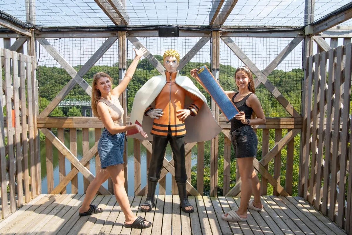 The area recreates the Hidden Leaf Village, featuring a large Hokage Rock monument and life-size figures of characters from the TV anime series. Visitors can experience the world of the series through interactive attractions, including athletic training activities and a three-dimensional maze.